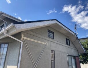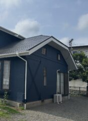 施工前は薄いベージュ系のお色でしたが、今回は外壁を紺色に塗装をさせて頂きました!破風板という屋根の側面の板は劣化しやすいため、塗装だけではまたすぐに痛みがでてしまいます。そのためガルバリウム鋼板によるカバー工法をお勧めいたします。