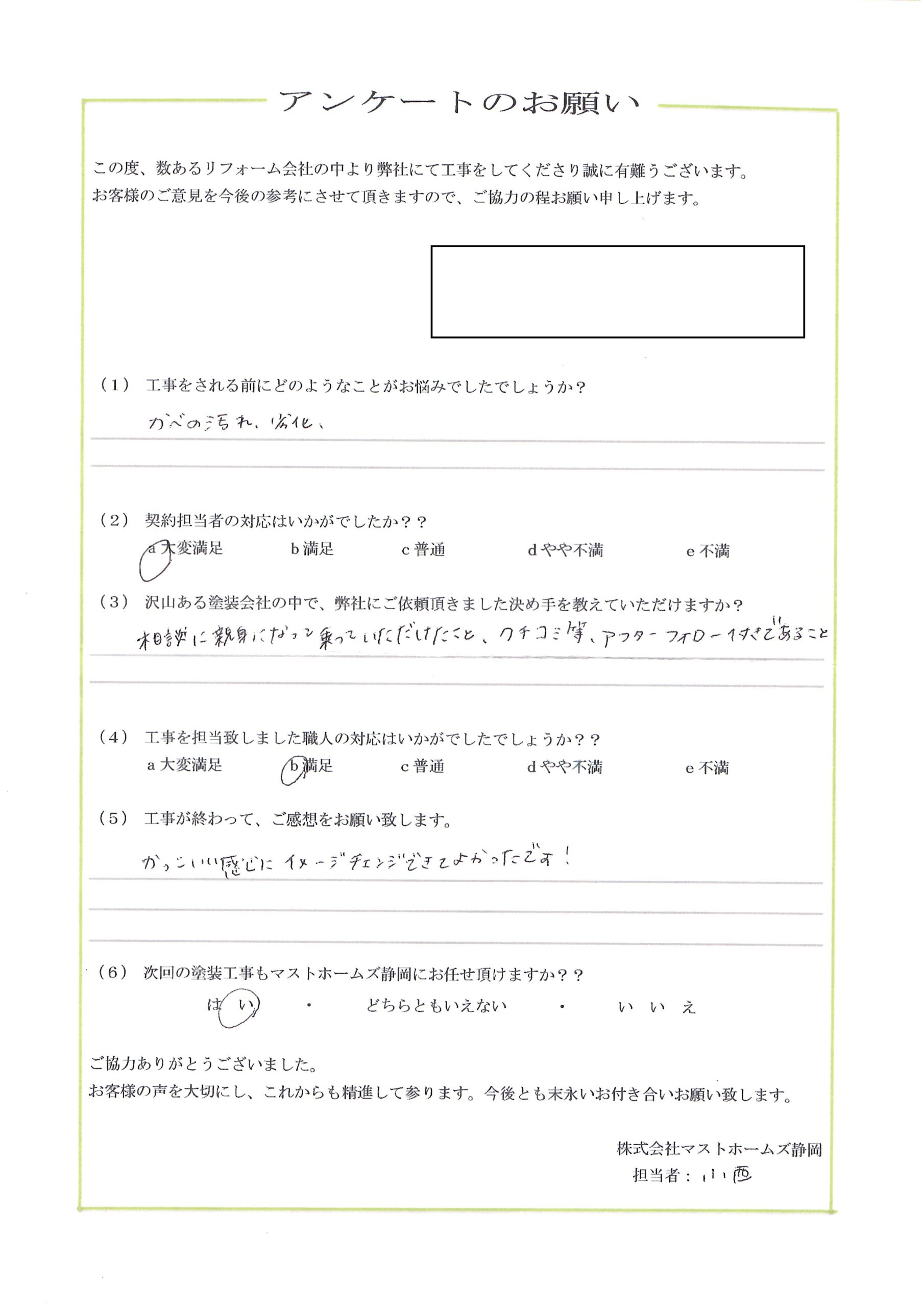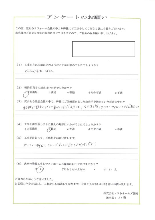 2025年11月12日 駿河区K様邸完成 地元静岡の塗装屋さん『マストホームズ静岡』 > 顧客アンケート > 2025 > 2025年11月12日 駿河区K様邸完成地区静岡市工事内容外壁塗装工事担当者コメント何社か比べて頂き、最終的に弊社で施工させて頂く事になりました。今後ともよろしくお願いいたします。施工後 アンケート CONTENTS会社概要スタッフ・職人紹介資格について契約までの流れお見積りについてアフターメンテナンス・保証バイオ洗浄とは?外壁の種類外壁の塗料についておすすめの塗料外壁塗装の耐用年数について外壁塗装の塗替えのタイミング外壁塗装に失敗しない業者選びのポイント