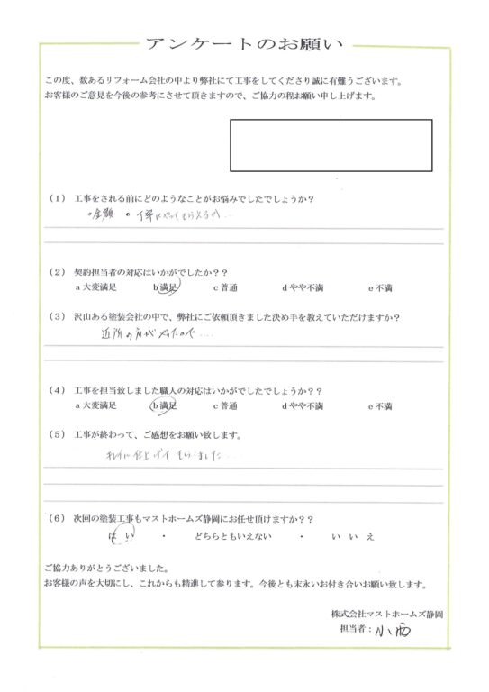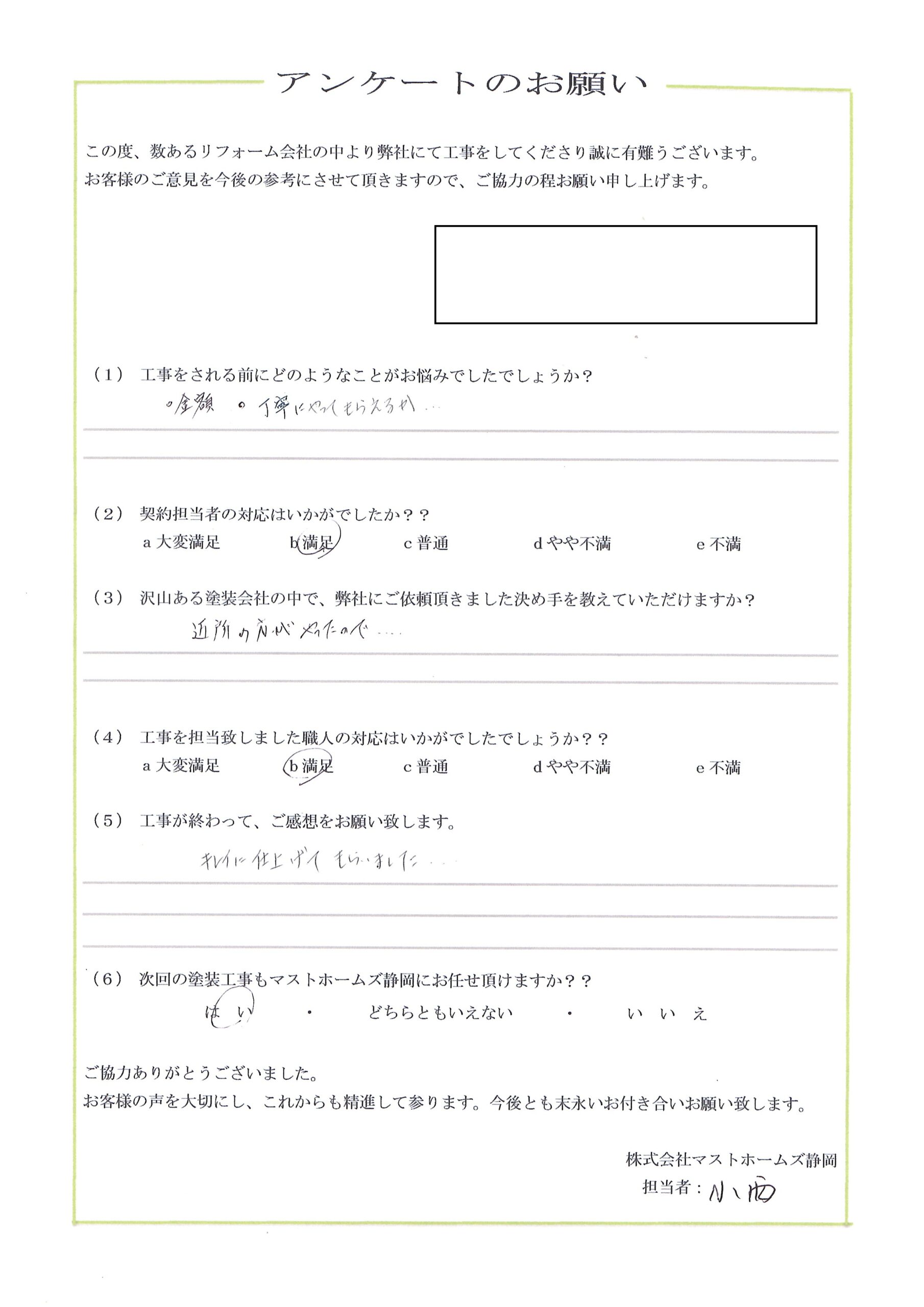 2025年11月20日 葵区S様邸完成 地元静岡の塗装屋さん『マストホームズ静岡』 > 顧客アンケート > 2025 > 2025年11月20日 葵区S様邸完成地区静岡市工事内容外壁塗装工事担当者コメントアーネストワン住宅の外壁塗装です。元々ツートンでしたが、単色3分艶で仕上げました。施主様にも喜んで頂きました。施工後 アンケート CONTENTS会社概要スタッフ・職人紹介資格について契約までの流れお見積りについてアフターメンテナンス・保証バイオ洗浄とは?外壁の種類外壁の塗料についておすすめの塗料外壁塗装の耐用年数について外壁塗装の塗替えのタイミング外壁塗装に失敗しない業者選びのポイント