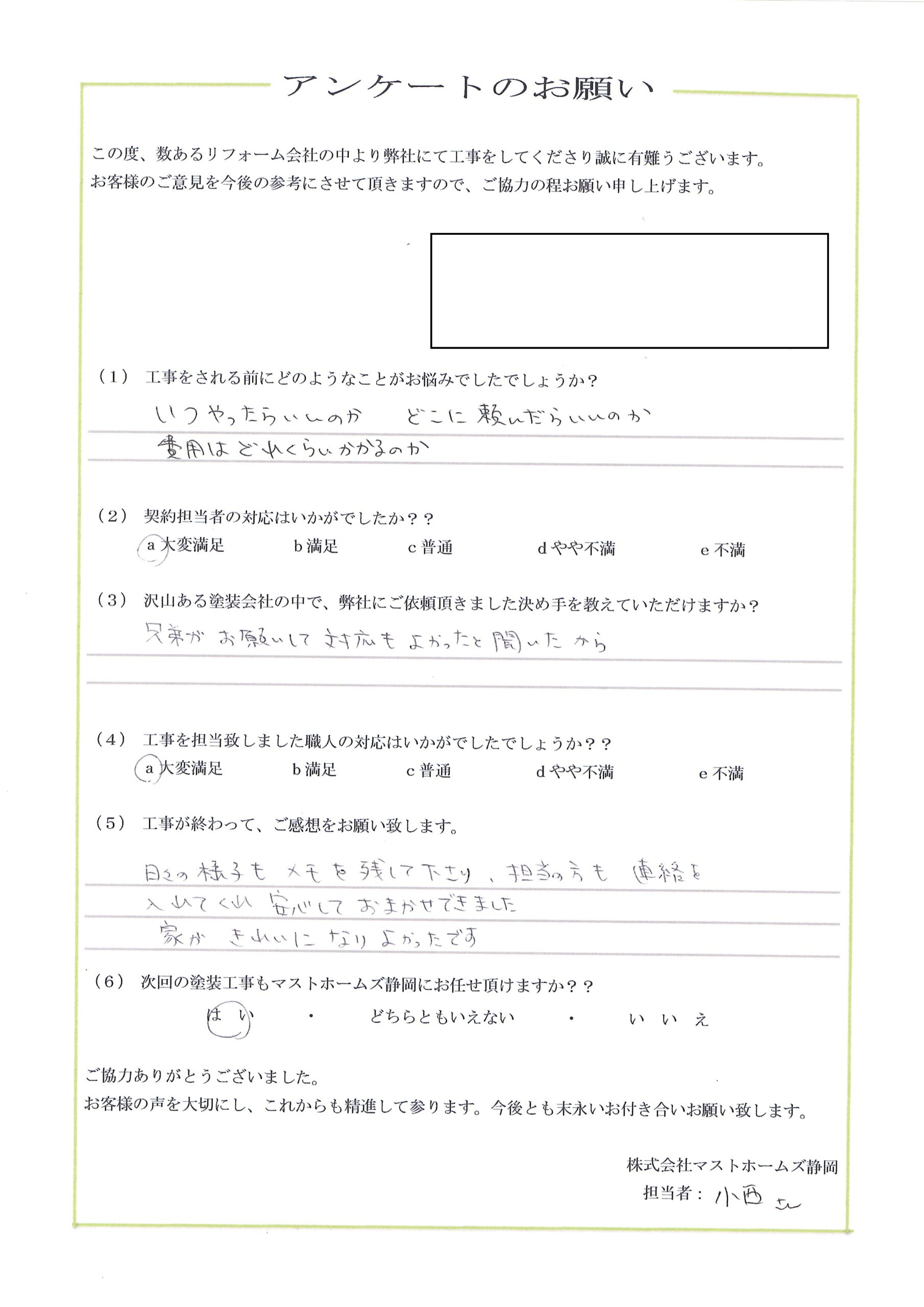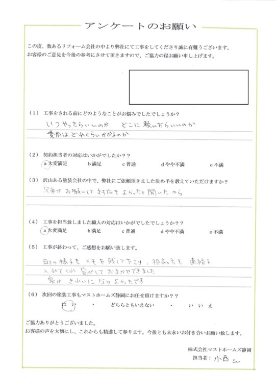2025年11月30日 清水区N様邸完成 地元静岡の塗装屋さん『マストホームズ静岡』 > 顧客アンケート > 2025 > 2025年11月30日 清水区N様邸完成地区静岡市工事内容外壁塗装工事担当者コメント顧客様からご紹介頂き施工させて頂きました。ツートンでとてもキレイに仕上がりました。施工後 アンケート CONTENTS会社概要スタッフ・職人紹介資格について契約までの流れお見積りについてアフターメンテナンス・保証バイオ洗浄とは?外壁の種類外壁の塗料についておすすめの塗料外壁塗装の耐用年数について外壁塗装の塗替えのタイミング外壁塗装に失敗しない業者選びのポイント