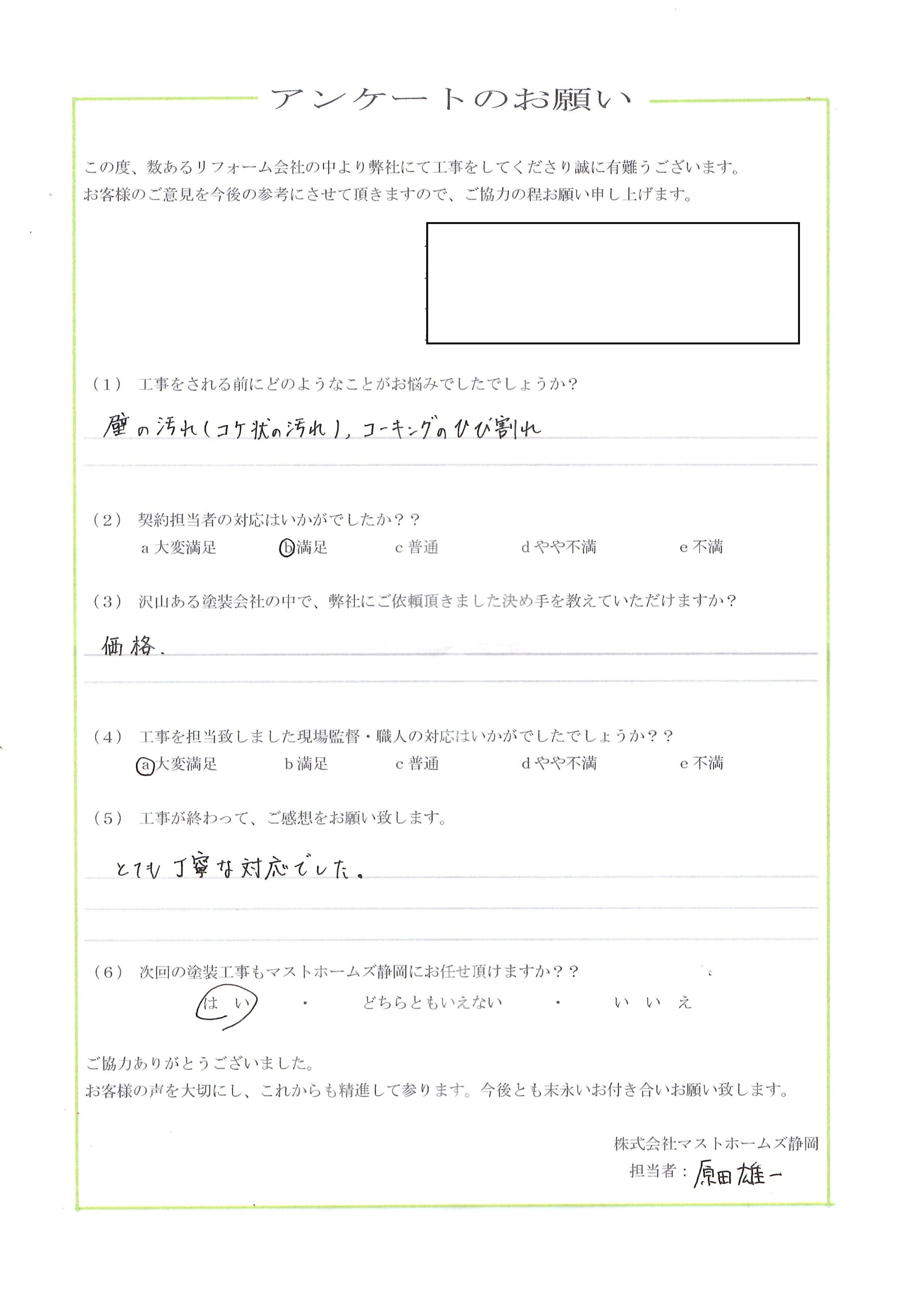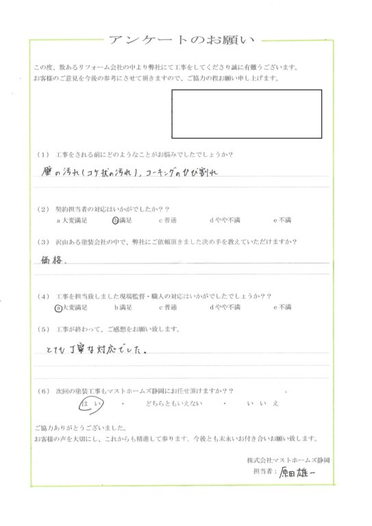 2025年12月20日 富士市T様邸完成 地元静岡の塗装屋さん『マストホームズ静岡』 > 顧客アンケート > 2025 > 2025年12月20日 富士市T様邸完成地区富士市工事内容外壁塗装工事担当者コメント外壁屋根を無機塗料で塗装させて頂きました。雰囲気も変わり喜んで頂きました。ありがとうございました。施工後 アンケート CONTENTS会社概要スタッフ・職人紹介資格について契約までの流れお見積りについてアフターメンテナンス・保証バイオ洗浄とは?外壁の種類外壁の塗料についておすすめの塗料外壁塗装の耐用年数について外壁塗装の塗替えのタイミング外壁塗装に失敗しない業者選びのポイント