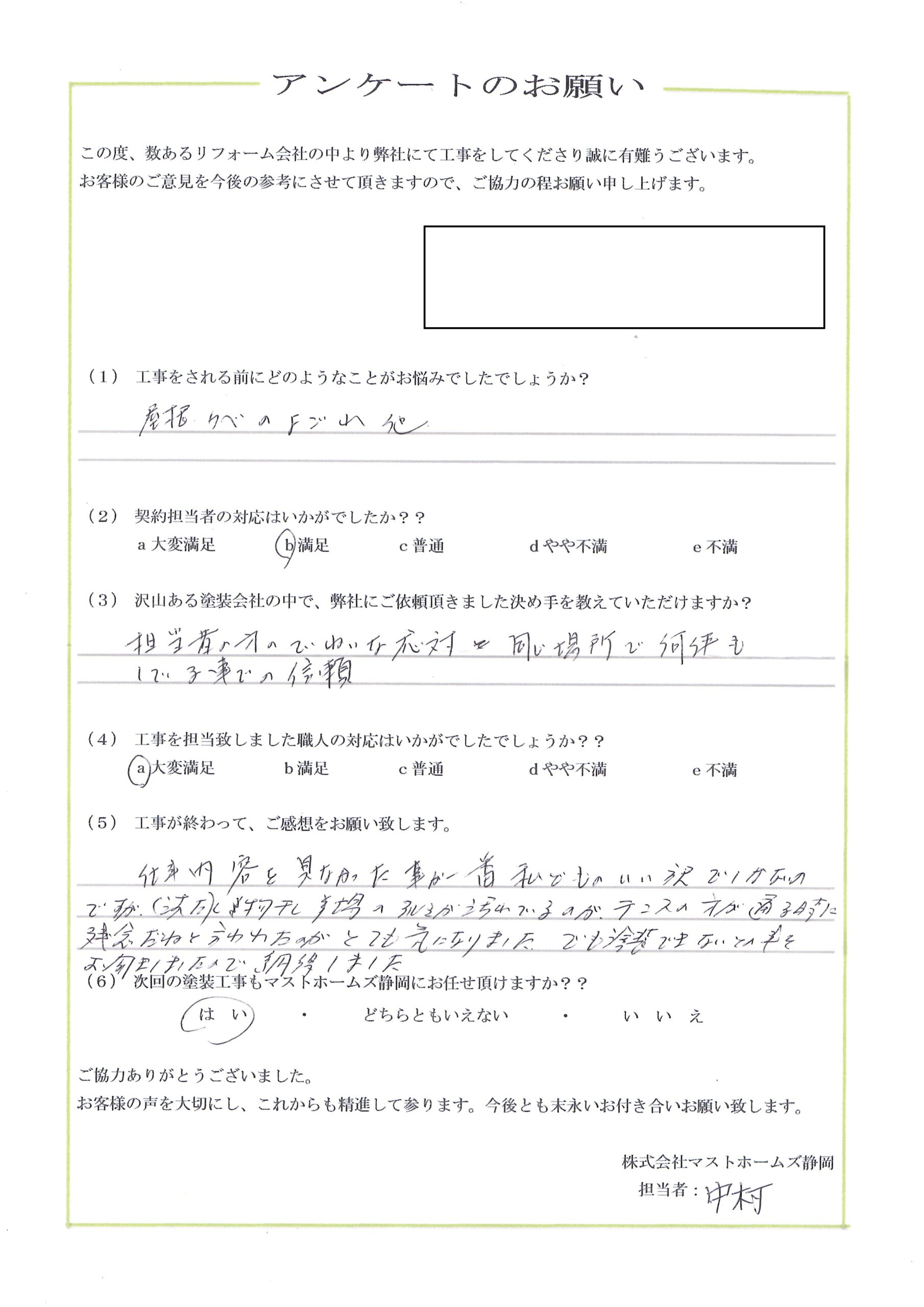 2026年2月8日 駿河区F様邸完成 地元静岡の塗装屋さん『マストホームズ静岡』 > 顧客アンケート > 2026年 > 2026年2月8日 駿河区F様邸完成地区静岡市工事内容外壁塗装工事担当者コメントこの度は弊社に施工のご依頼頂きありがとうございました。これからも宜しくお願いします。施工後 アンケート CONTENTS会社概要スタッフ・職人紹介資格について契約までの流れお見積りについてアフターメンテナンス・保証バイオ洗浄とは?外壁の種類外壁の塗料についておすすめの塗料外壁塗装の耐用年数について外壁塗装の塗替えのタイミング外壁塗装に失敗しない業者選びのポイント
