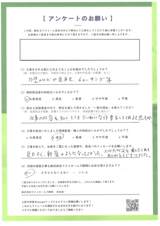 2026年3月25日 富士市F様邸完成 地元静岡の塗装屋さん『マストホームズ静岡』 > 顧客アンケート > 2026年 > 2026年3月25日 富士市F様邸完成地区富士市工事内容外壁塗装工事担当者コメント前回塗装から年数が経過していましたので、外壁の劣化を気にされていました。仕上がりに大変ご満足頂けました。ありがとうございました。施工後 アンケート CONTENTS会社概要スタッフ・職人紹介資格について契約までの流れお見積りについてアフターメンテナンス・保証バイオ洗浄とは?外壁の種類外壁の塗料についておすすめの塗料外壁塗装の耐用年数について外壁塗装の塗替えのタイミング外壁塗装に失敗しない業者選びのポイント