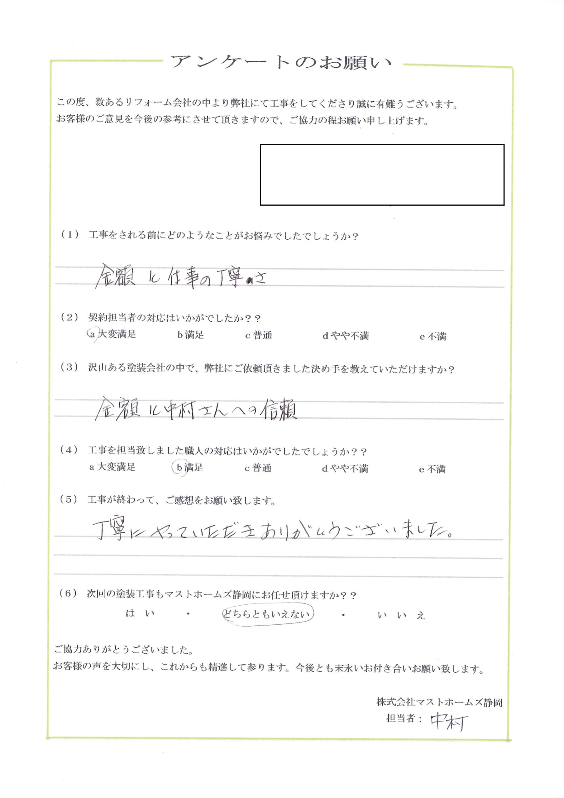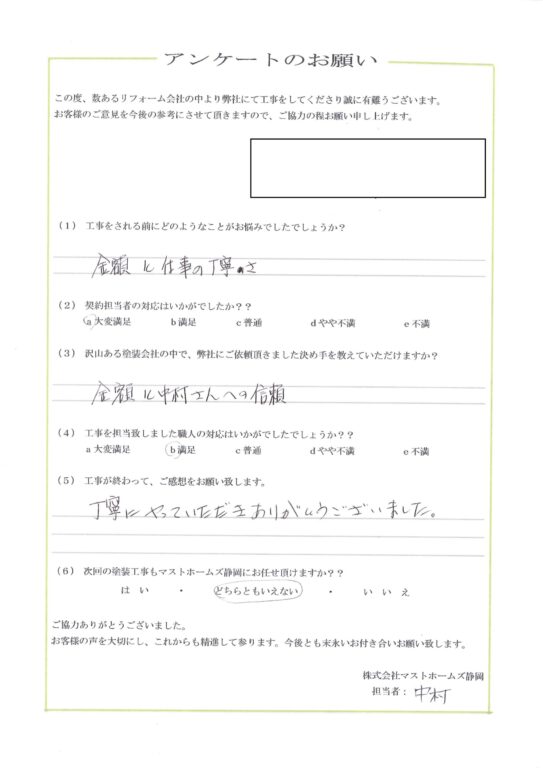 2026年3月7日 島田市Y様邸完成 地元静岡の塗装屋さん『マストホームズ静岡』 > 顧客アンケート > 2026年 > 2026年3月7日 島田市Y様邸完成地区島田市工事内容外壁塗装工事担当者コメントこの度は弊社に施工のご依頼を頂き誠にありがとうございました。今後ともよろしくお願いいたします。施工後 アンケート CONTENTS会社概要スタッフ・職人紹介資格について契約までの流れお見積りについてアフターメンテナンス・保証バイオ洗浄とは?外壁の種類外壁の塗料についておすすめの塗料外壁塗装の耐用年数について外壁塗装の塗替えのタイミング外壁塗装に失敗しない業者選びのポイント
